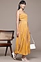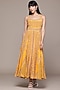 Ritu Kumar presents a yellow maxi dress in viscose crepe base with digital print. Accentuate it with statement earrings and heels for an evening look.