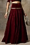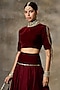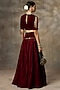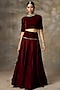 Featuring a maroon lehenga in silk base. It is paired with a velvet blouse. Accentuate with statement jewellery and heels for a sangeet or cocktail ceremony.