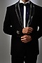 Featuring a black blazer jacket in imported suiting base. It is paired with a matching waistcoat, a bow and trousers, including a contrasting white shirt. Perfect wear for an engagement or a wedding ceremony.