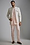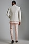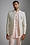 Featuring a cream indowestern jacket in silk base in thread and resham embroidery. It is paired with a contrasting peach bandhgala jacket and pants.
