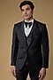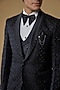 Featuring a grease black tuxedo in jacquard base with cutdana hand work. It is paired with a waistcoat, pants, a white shirt and a bow-tie. Perfect for weddings or receptions.
