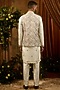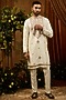 Featuring an ivory nehru jacket in silk base with multi-colored thread embroidery. It is paired with a kurta and pants. Perfect wear for festive occasion or wedding ceremony.