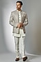Featuring an off-white indo-western jacket in silk base with kasab, resham, thread and sequins detail. It is paired with a matching jacket and pants. Perfect wear for weddings or engagement ceremony.