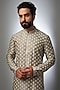 Featuring an olive green kurta in silk base. It is paired with contrasting churidar pants. Perfect wear for a festive occasion, pooja or mehendi ceremony.