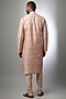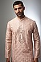 Featuring a peach kurta in silk base. It is paired with contrasting churidar pants. Perfect wear for a festive occasion or a pooja ceremony.