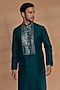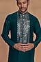 Featuring a persian blue kurta in silk base with a mandarin collar, leather and mirror work. It is paired with white churidar. Perfect attire for a festive occasion, wedding or engagement ceremony, exuding charm and elegance.