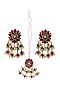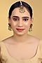 Featuring a pair of gold finish dangler earrings studded with kundan polki, pearl drops and multi-colored kemp stones, set in brass. It is paired with a maangtikka. These earrings set radiates timeless elegance, perfect for wedding celebrations, festive soirees or cultural gatherings adding a regal charm to every look.