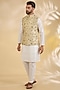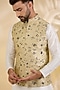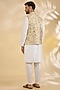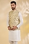 Featuring a beige bundi jacket in brocade silk base with metal buttons and zari print. Style it with a kurta set and mojaris for a festive occasion, sangeet, wedding or engagement ceremony.