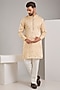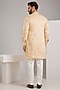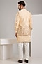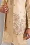 Featuring a beige long jacket in cotton silk base with resham and sequins embroidery. It is paired with cotton silk embroidered kurta and dupion silk mexican pants. Style it with mojaris for a sangeet, wedding or engagement ceremony.