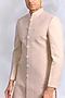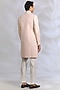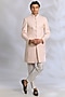 Featuring a blush pink indowestern in raw silk base with resham and sequins embroidery. It is paired with off-white dupion silk pants. Style it with mojaris for a wedding or engagement ceremony.