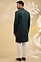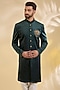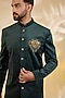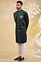 Featuring a bottle green achkan in suede base with gold metal emblem detail and zari embroidery. It is paired with off-white dupion silk pants. Style it with malas and leather mojaris for a wedding, mehendi, sangeet or engagement ceremony.