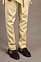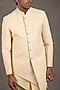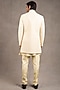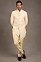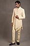 Featuring a cream asymmetrical achkan jacket in raw silk base with chikan and sequins embroidery. It is paired with a matching kurta in modal silk base and a dupion silk mexican pants.
