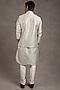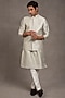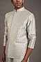 Featuring a duck egg grey bundi jacket in raw silk base with mirror and thread embroidery. It is paired with a matching kurta in dupion silk base and white pants.