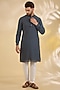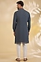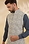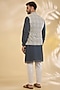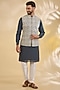 Featuring a grey bundi jacket in raw silk base with thread embroidery. It is paired with a georgette kurta and off-white dupion silk pants. Style it with a mojaris for a festive occasion, sangeet, wedding or engagement ceremony.