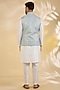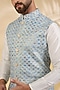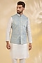 Featuring a light blue bundi jacket in raw silk base with metal buttons and geometric print. Style it with a kurta set and mojaris for a festive occasion, wedding or engagement ceremony.