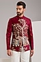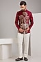 Featuring a maroon bandhgala in suede base with motif resham embroidery. It is paired with off-white french terry pants. Style it with loafers for a cultural event, reception, wedding or engagement ceremony.