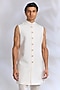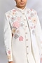 Featuring an off-white open indowestern jacket in french terry base with cutdana and bead embroidery. It is paired with a jacket inner having embroidered buttons and dupion silk pants. Style it with mojaris for a sangeet, wedding or festive ceremony.