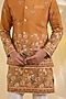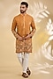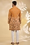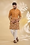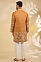 Featuring an orange bundi jacket in cotton silk base with zari and thread embroidery. It is paired with a kurta and off-white dupion silk pants. Style it with mojaris for a grand festive celebration, wedding, sangeet or engagement ceremony.