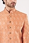 Featuring an orange ajkan jacket in raw silk base with thread and zari embroidery. It is paired with contrasting dupion silk mexican pants.
