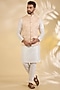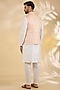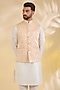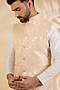 Featuring a peach bundi jacket in brocade silk base with metal buttons and zari print. Style it with a kurta set and mojaris for a festive occasion, wedding or engagement ceremony.