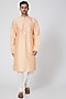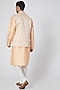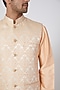Featuring a peach jacket in brocade base with butti print and metal buttons. It is paired with a matching kurta in raw silk base and white churidar pants.