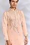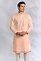 Featuring a peach kurta in crepe silk base with resham embroidery. It is paired with off-white dupion silk pants. Style it with kolhapuri sandals for a festive occasion, family gathering or pooja ceremony.