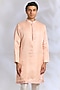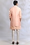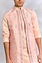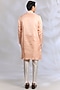 Featuring a peach open jacket in crepe silk base with resham embroidery. It is paired with a kurta and off-white dupion silk pants. Style it with mojaris for a sangeet, wedding or engagement ceremony.