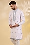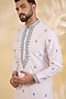 Featuring a pink kurta in cotton silk base with sequins and thread embroidery. It is paired with off-white dupion silk pants. Style it with mojaris for a festive occasion, wedding or engagement ceremony.