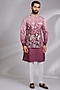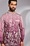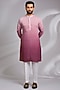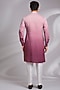 Featuring a pink ombre bundi jacket in raw silk base with thread embroidery. It is paired with a cotton silk kurta and off-white dupion silk mexican pants. Style it with mojaris for a festive celebration, reception, wedding or engagement ceremony.