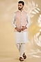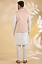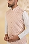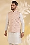 Featuring a pink bundi jacket in raw silk base with metal buttons and block print. Style it with a kurta set and mojaris for a festive occasion, sangeet, wedding or engagement ceremony.
