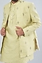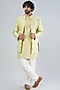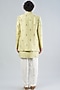 Featuring a pista green open jacket in raw silk base with thread and mirror embroidered motifs. It is paired with a matching cotton silk embroidered kurta and contrasting dupion silk mexican pants.