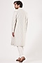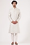 Featuring a powder blue ajkan jacket in raw silk base with thread and sequins embroidery. It is paired with contrasting dupion silk mexican pants.