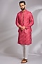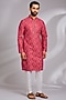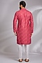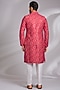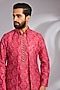 Featuring a red bundi jacket in cotton silk base with sequins and resham embroidery. It is paired with a kurta and off-white dupion silk mexican pants. Style it with mojaris for a festive celebration, reception, wedding or engagement ceremony.