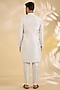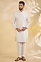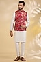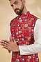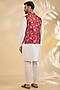 Featuring a red bundi jacket in raw silk base with floral print. It is paired with a white cotton silk kurta and off-white dupion silk pants. Style it with mojaris for a wedding, sangeet or engagement ceremony.