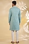 Featuring a sea blue indowestern jacket in raw silk base with zari and thread embroidery. It is paired with a cotton silk kurta and off-white dupion silk pants. Style it with mojaris for a grand festive celebration, wedding, sangeet or engagement ceremony.