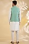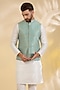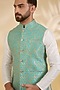Featuring a sea green bundi jacket in brocade silk base with metal buttons and geometric print. Style it with a kurta set and mojaris for a festive occasion, wedding or engagement ceremony.