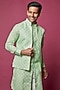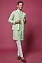 Featuring a sea green open indowestern jacket in cotton linen base with print. It is paired with a matching printed kurta and contrasting off-white dupion silk pants.
