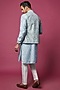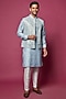 Featuring a sky blue open indowestern jacket in raw silk base with print. It is paired with a matching cotton silk printed kurta and contrasting off-white dupion silk pants.