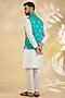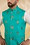 Featuring a teal green bundi jacket in brocade silk base with metal buttons and zari block motifs print. Style it with a kurta set and mojaris for a festive occasion, mehendi, summer wedding or engagement ceremony.