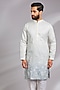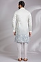 Featuring a white and blue ombre kurta in cotton silk base with thread embroidery. It is paired with off-white dupion silk mexican pants. Style it with mojaris for a festive celebration, cultural event, wedding or engagement ceremony.