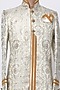 Featuring a white indo western jacket in brocade silk base with stone buttons. This contains only one piece.