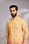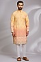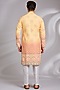 Featuring a yellow ombre kurta in cotton silk base with print and chikankari embroidery. It is paired with off-white dupion silk mexican pants. Style it with mojaris for a festive celebration, cultural event, wedding or engagement ceremony.