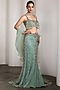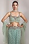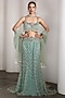 Featuring an aqua lehenga in net base with hand embroidery. It is paired with a blouse having sequins work and embellishments, including a sheer dupatta. Accentuate it with statement jewellery and heels for a cocktail, sangeet or engagement ceremony.