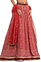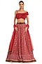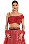 Featuring a deep red lehenga in raw silk and georgette base with mirror work and an attached buckle. It is paired with a matching silk embroidered ruffle blouse and a net boota embroidered dupatta.