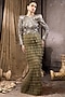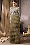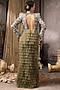Featuring a green ruffled gown in tulle, raw silk and net base with sequins hand embellishment. Accentuate it with diamond earrings, block heels and a clutch for cocktail soirees or sangeet ceremonies.