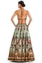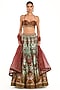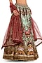 Featuring a light blue lehenga in raw silk base with digital print. It is paired with a contrasting maroon brocade tie-up blouse and a net embroidered dupatta.