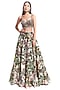 Featuring a multi colored frill skirt in raw silk base with botanical print and cutdana jewelled belt. It is paired with a matching handcrafted bustier having sequins and cutdana embroidery.