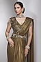 Featuring an olive-gold draped saree in georgette and net base. It is paired with a blouse having floral detailing, sequins and beadwork. Accentuate it with statement jewellery and heels for a cocktail, sangeet or engagement ceremony.