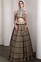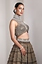 Featuring an olive ruffled lehenga in net and raw silk base. It is paired with a crystal and bead hand embellished crop top having a high-neckline. Accentuate it with statement earrings and block heels for mehendi or wedding ceremonies.
