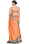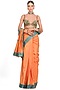 Featuring an orange saree in chanderi base with scattered embroidery. It is paired with a contrasting printed bustier and an underskirt. Accentuate it with dangler earrings and heels for a festive occasion or haldi ceremony.